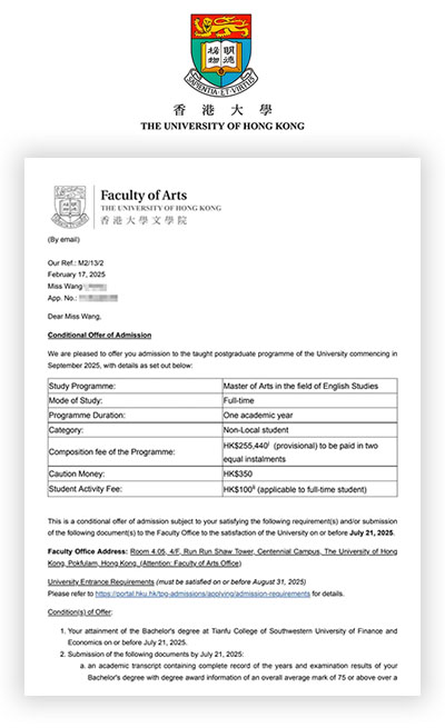 官方信息披露,今年香港大学面向非本地学生的录取率仅为5%!中国香港知名院校数量本来就少,申请量年年递增,但录取率依旧维持个位数,可见内地学生申请竞争激烈程度。值得庆贺的是,在这5%的概率中,我们有幸帮助来自西南财经大学天府学院的王**同学成功获取了香港大学的研究生录取通知!
