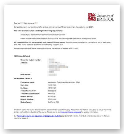 布里斯托大学实力强劲,在最新 2026 年 QS 世界大学排名中位列第 51 位,英国境内排名紧随曼彻斯特大学之后。其商科类热门专业常年竞争激烈,“一位难求” 已成常态。而在本次申请季中,我们的学员不仅早早拿下布大商学院 Offer,还成功减免语言条件 —— 这意味着学员已提前锁定硕士入学资格,后续只需满足最终学术均分要求,即可顺利入读。