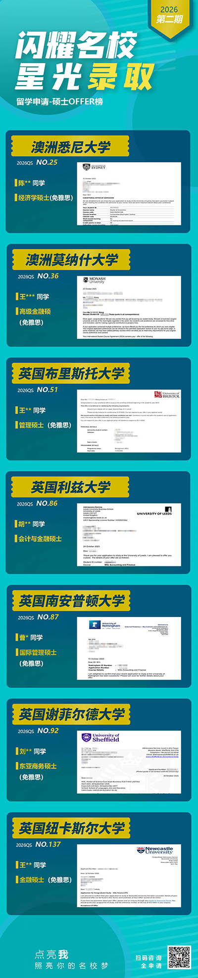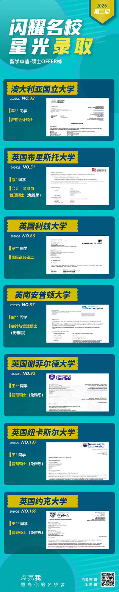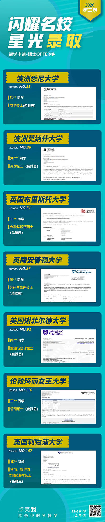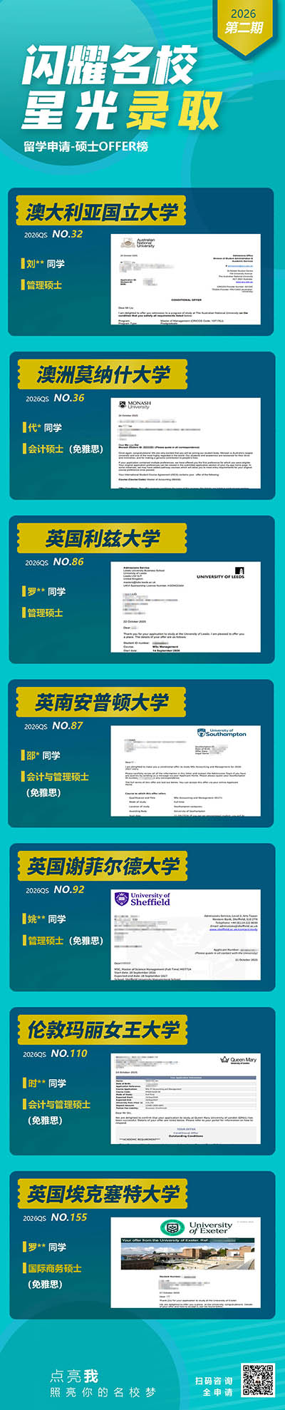 在首期佳绩的基础上,西财天府3+1海本同学们乘胜追击,在我们的助力下,再次横扫悉尼大学、澳大利亚国立大学、莫纳什大学、布里斯托大学,利兹大学,南安普顿大学等世界百强名校的硕士Offer!