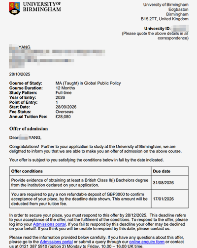 近期海外院校录取offer捷报频传,其中我们的学生也成功斩获了伯明翰大学的offer,录取专业为会计与金融硕士以及全球公共政策硕士。