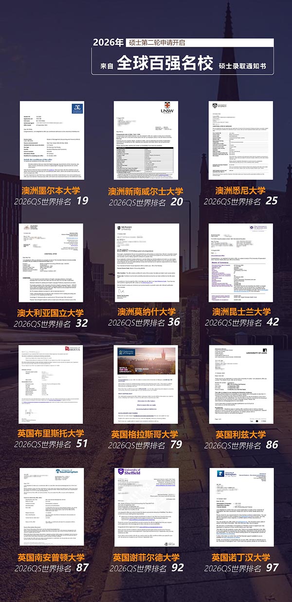 硕士首轮申请过后,同学们都已经获得了不少录取通知书,包括澳洲悉尼大学、澳洲国立大学、莫纳什大学、昆士兰大学以及英国布里斯托大学、伯明翰大学、格拉斯哥大学、南安普顿大学、利兹大学、谢菲尔德大学、诺丁汉大学等众多百强名校。