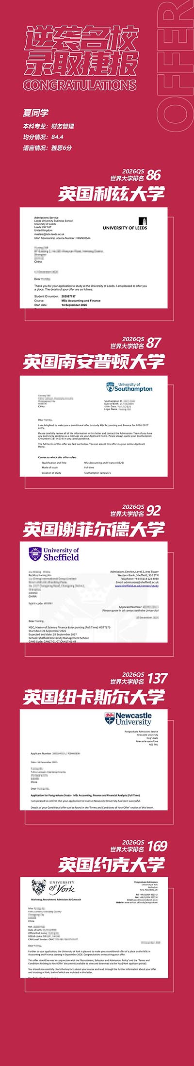 夏同学已经获得了包括利兹大学、南安普顿大学、谢菲尔德大学、纽卡斯尔大学(免雅思)、利物浦大学等在内的多所知名高校的硕士录取通知书,展现了她在学术领域的卓越成就和广泛认可。